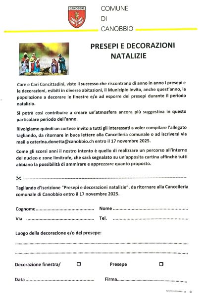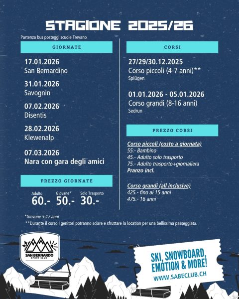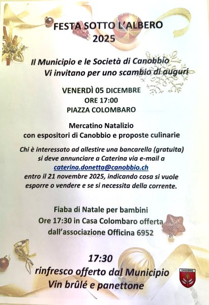 Eventi e manifestazioni Agenda Agenda Mese Novembre 2025 – Gennaio 2026 Nov 2025 – Gen 2026 Riduci tutto Espandi tutto Nov 23 Dom Carnevale Goss – Tombola San Nicolao Casa Colombaro ore 14:00 Biglietti Nov 23 giorno intero Dic 1 Lun Presepi e decorazioni Natalizie 2025 Biglietti Dic 1 giorno intero Dic 4 Gio Burraco-briscola-scopa-partita a carte- Osteria Centrale il 1° giovedì del mese ore 19:00 Biglietti Dic 4@11:06–12:06 Dic 5 Ven Festa sotto l’Albero 2025 e San Nicolao – Piazza Colombaro ore 17:00 Biglietti Dic 5 giorno intero Dic 14 Dom I Vus da Canöbia – Concerto di Natale – Chiesa San Siro Canobbio Biglietti Dic 14 giorno intero Dic 21 Dom Associazione Terza Età – Pranzo di Natale in Casa Colombaro Biglietti Dic 21 giorno intero Dic 27 Sab San Bernardo Sport Club – corso diurno per i piccoli (4-7 anni) Splügen 27.12.2025 Biglietti Dic 27 giorno intero Dic 29 Lun San Bernardo Sport Club – corso diurno per i piccoli (4-7 anni) Splügen 29-30.12.2025 Biglietti Dic 29–Dic 30 giorno intero Gen 8 Gio Burraco-briscola-scopa-partita a carte- Osteria Centrale il 1° giovedì del mese ore 19:00 Biglietti Gen 8@11:06–12:06 Novembre 2025 – Gennaio 2026 Nov 2025 – Gen 2026 Sottoscrivi Aggiunti al Calendario di Timely Aggiungi a Google Aggiungi ad Outlook Aggiungi al Calendario Apple Aggiungi ad altro calendario Export to XML